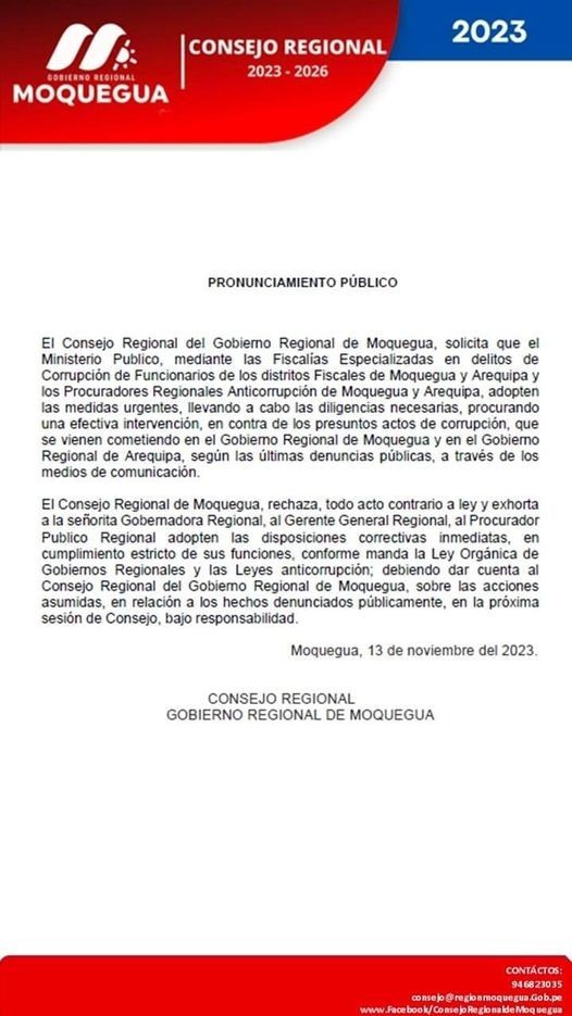 Noticias Regional II Pronunciamiento público del Consejo Regional de Moquegua. Carlos Augusto Benites Portocarrero editor posteado en hace 2 años — actualizado el hace 1 segundo 726 puntos de vista #moquegua # Consejoregional II Pronunciamiento público del Consejo Regional de Moquegua. Carlos Augusto Benites Portocarrero seguir conversaciones de facebook